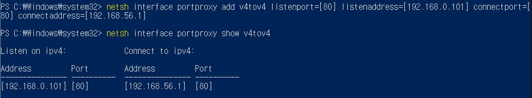 # netsh interface portproxy add v4tov4 listenport=[받은 Port] listenaddress=[받은 IP] connectport=[보낼 Port] connectaddress=[보낼 IP]