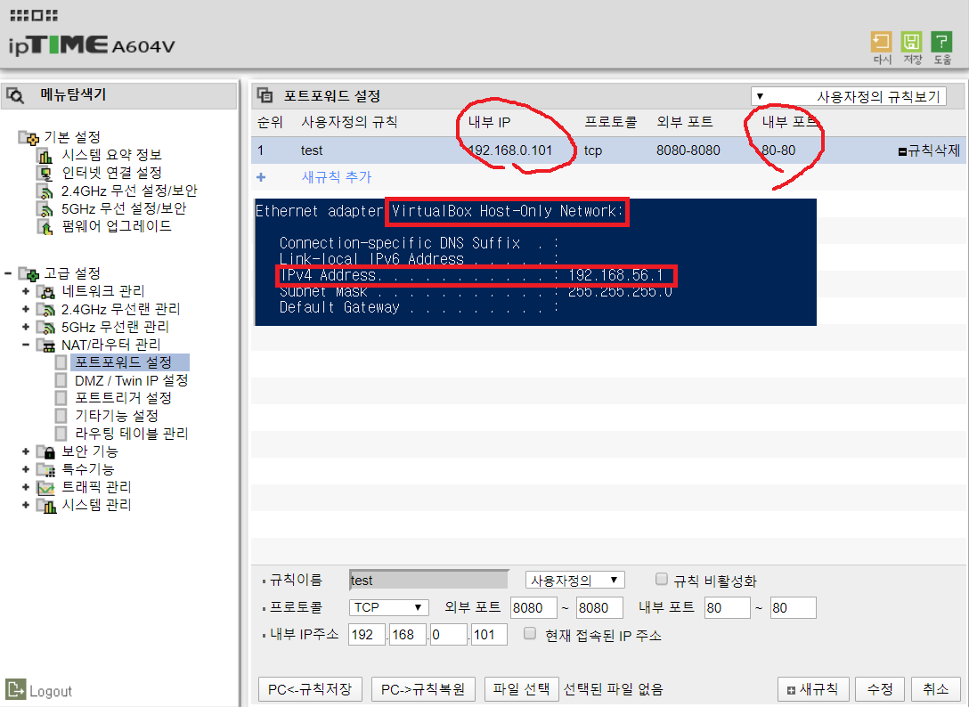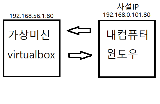 내부 ip:port는 192.168.0.101:80이다 가상 머신에 포워딩한 ip:port는 192.168.56.1:80이다.
