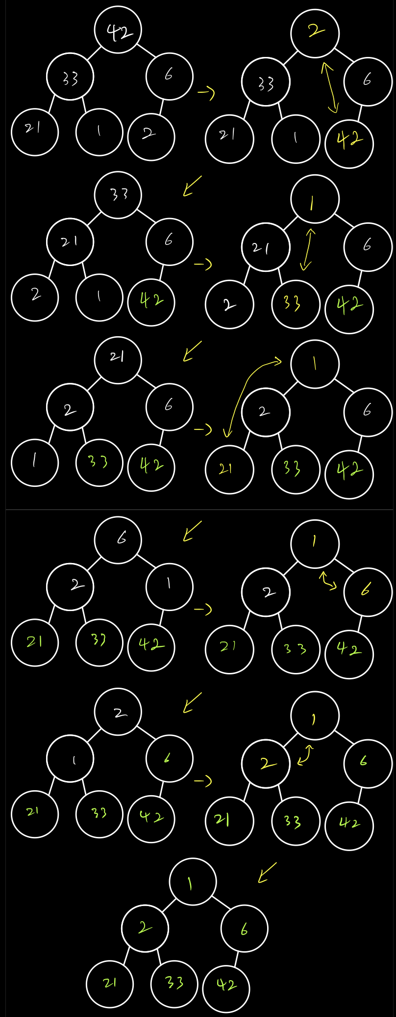 최상위 노드를 마지막 노드로 바꿔주는 과정을 반복하면 힙 정렬이 된다.