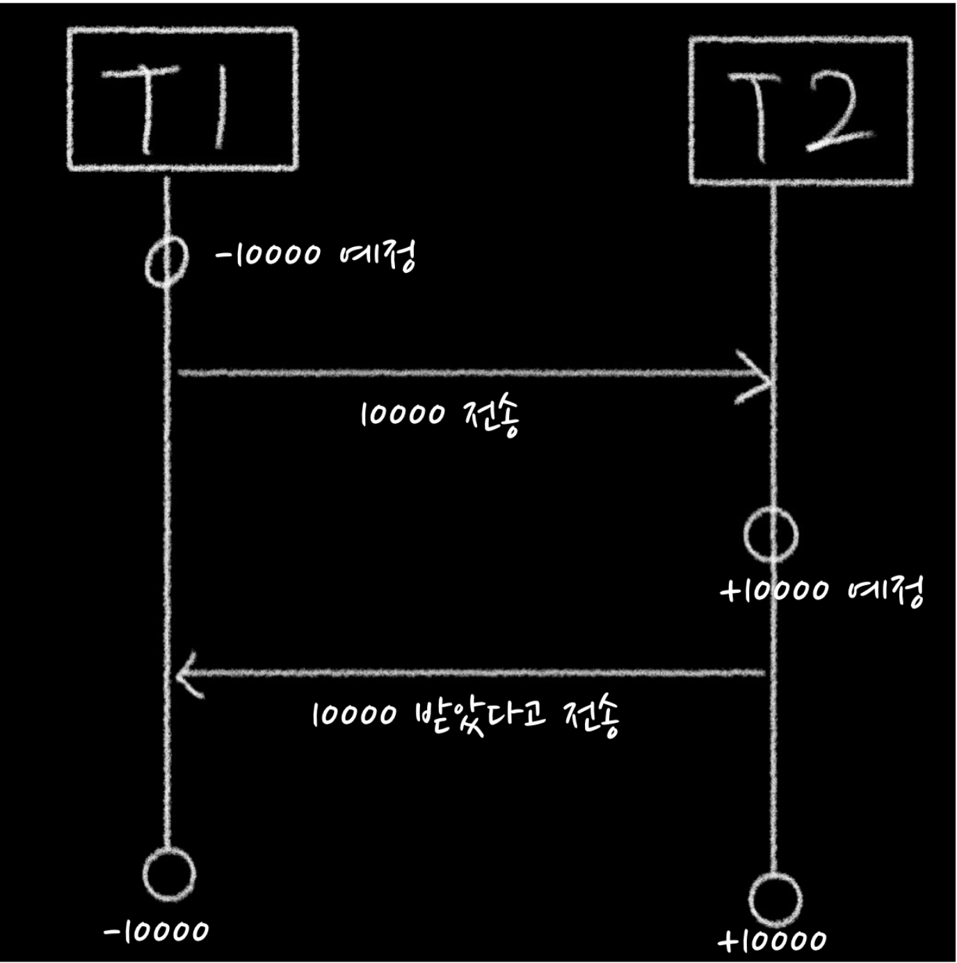 동기식 처리는 T1, T2의 -10000, +10000이 동시에 일어나기 위한 것으로, T1의 전송, T2의 결과 전송 후 동시에 진행 되어야 한다.