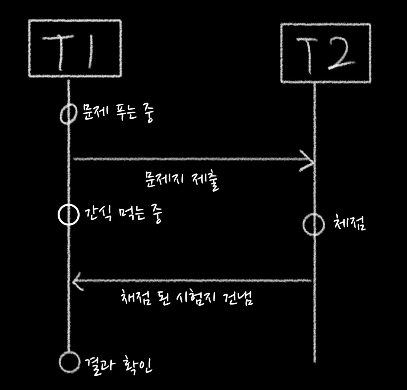 비동기식 처리는 T1의 문제지 결과를 T2에게 요청 후 결과가 오기 전에 다른 작업(간식 먹는 중)을 할 수 있는 처리방식이다.