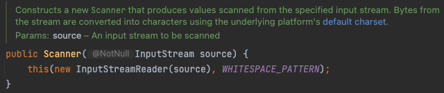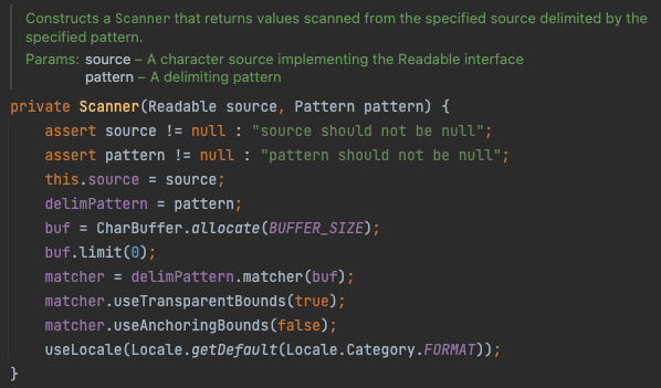 자세히 보면 Scanner() 생성자들이 this를 통해서 private Scanner(Readable source, Pattern pattern) 으로 넘겨진다.