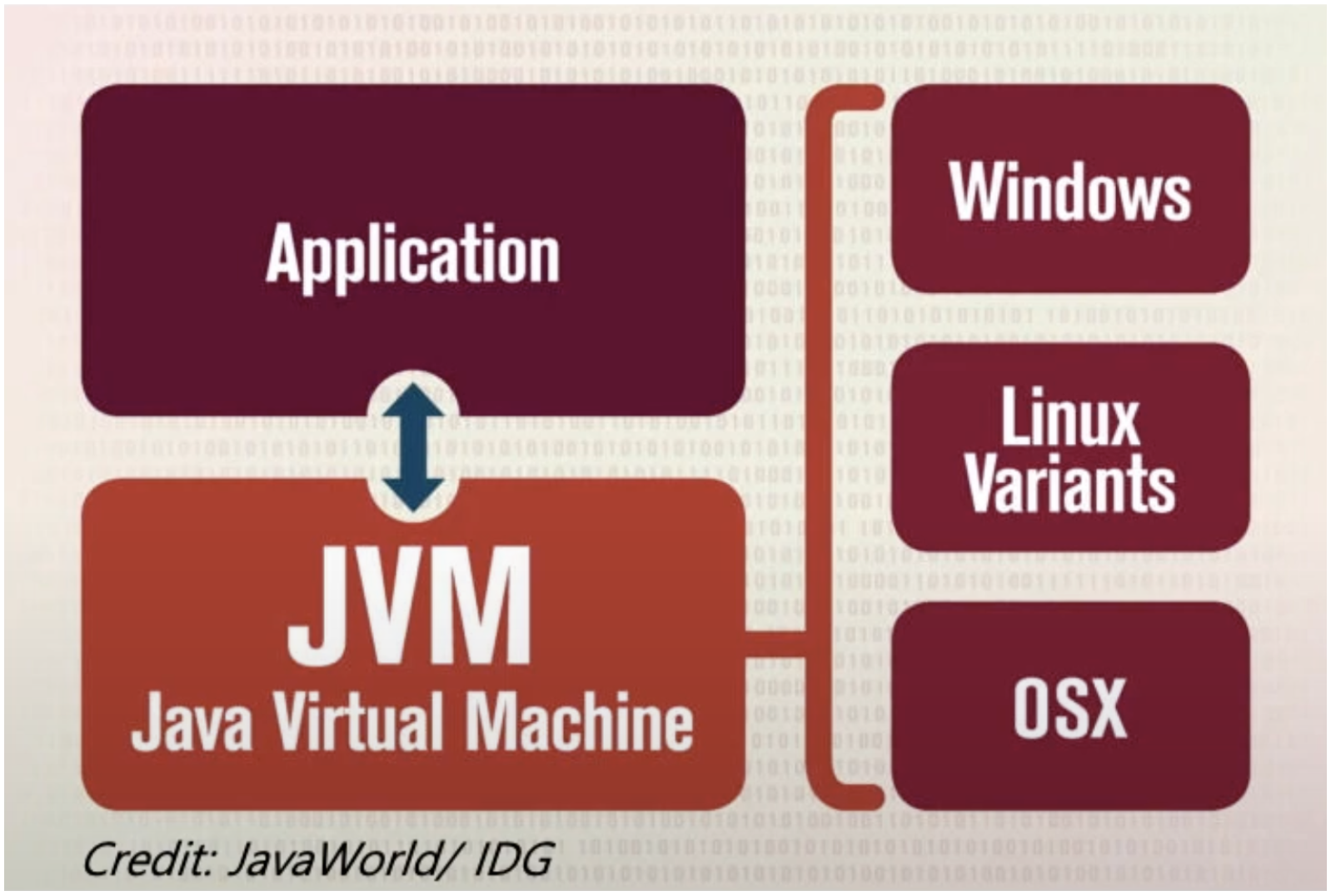 JVM은 자바 소스코드로부터 만들어지는 자바 바이너리 파일(.class)을 실행할 수 있다. 또한 JVM은 플랫폼에 의존적이다. 즉 리눅스의 JVM과 윈도우즈의 JVM은 다르다. 단, 컴파일된 바이너리 코드는 어떤 JVM에서도 동작시킬 수 있다.
