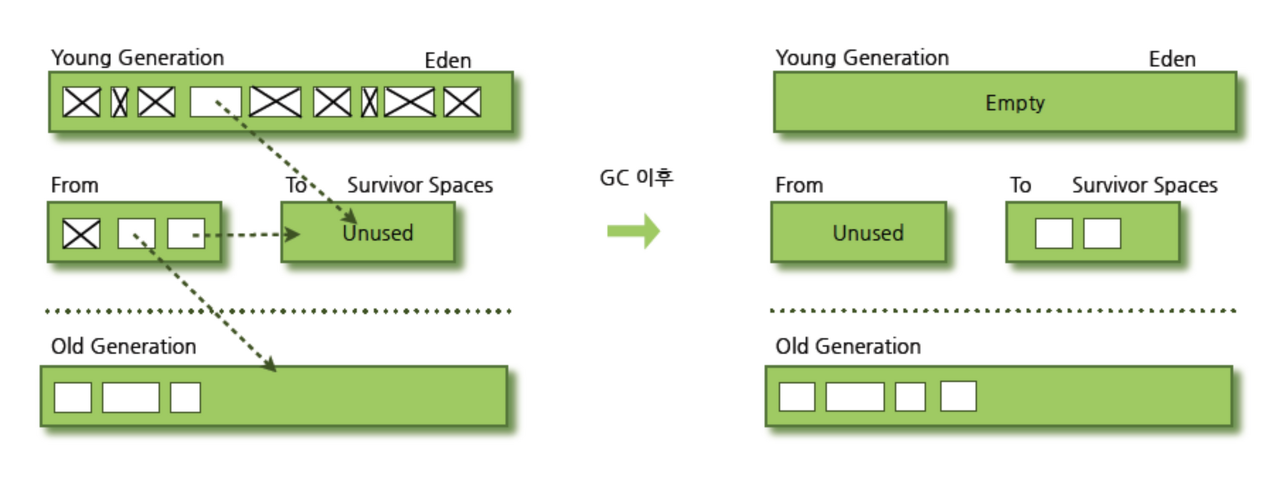 - Eden 영역에서 사용되지 않는 객체의 메모리가 해제된다.