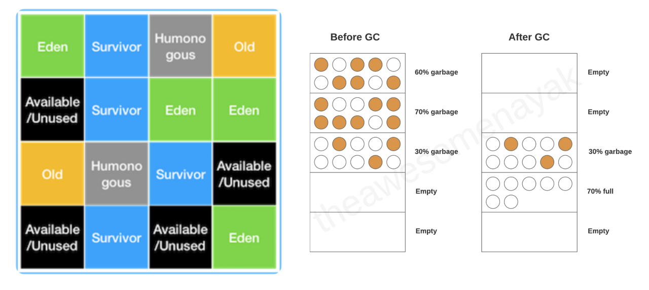 전체 힙을 고정된 크기의 영역으로 분할하고 각 영역을 별도로 관리합니다. 이를 통해 전체 힙을 스캔하지 않고 부분적인 가비지 수집을 수행할 수 있다.