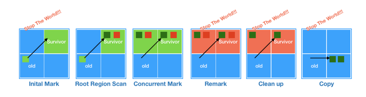 - Old Region에 존재하는 객체들이 참조하는 Survivor Region을 찾는다. 이 과정에서는 STW 현상이 발생하게 된다.