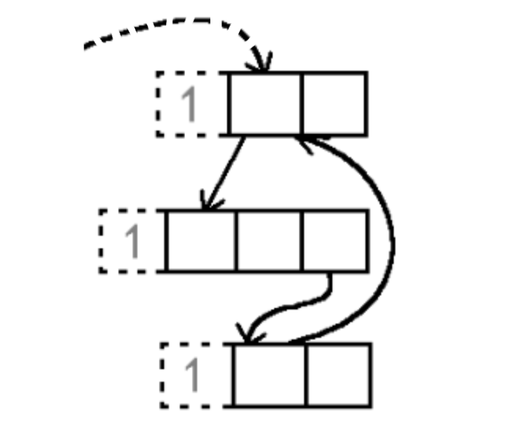 Root Space로부터 끊어져도 객체들이 서로가 서소를 참조하고 있어 Reference Counting가 1로 유지된다(Reachable). 결국 사용하지 않는 메모리 영역이 해제되지 못하고 Memory Leak이 방생한다.