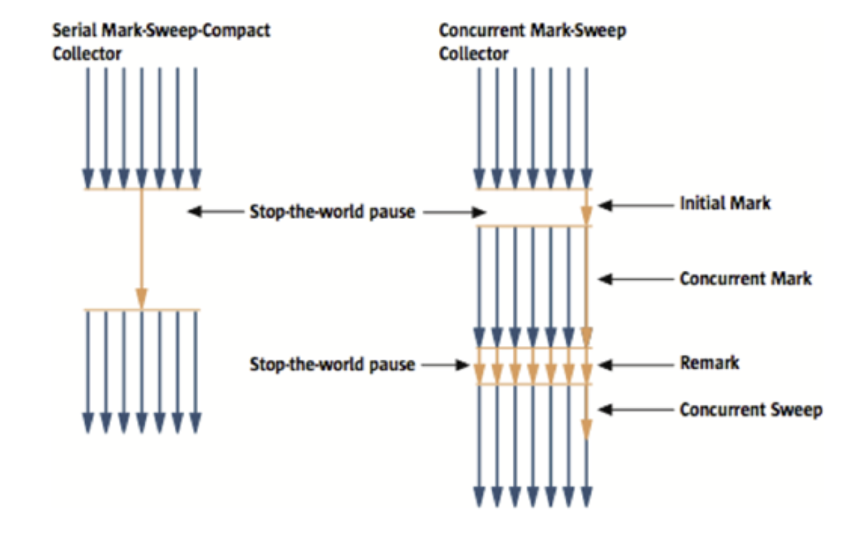다음 그림은 Serial GC와 CMS GC의 절차를 비교한 그림이다. 그림에서 보듯이 CMS GC는 지금까지 설명한 GC 방식보다 더 복잡하다.