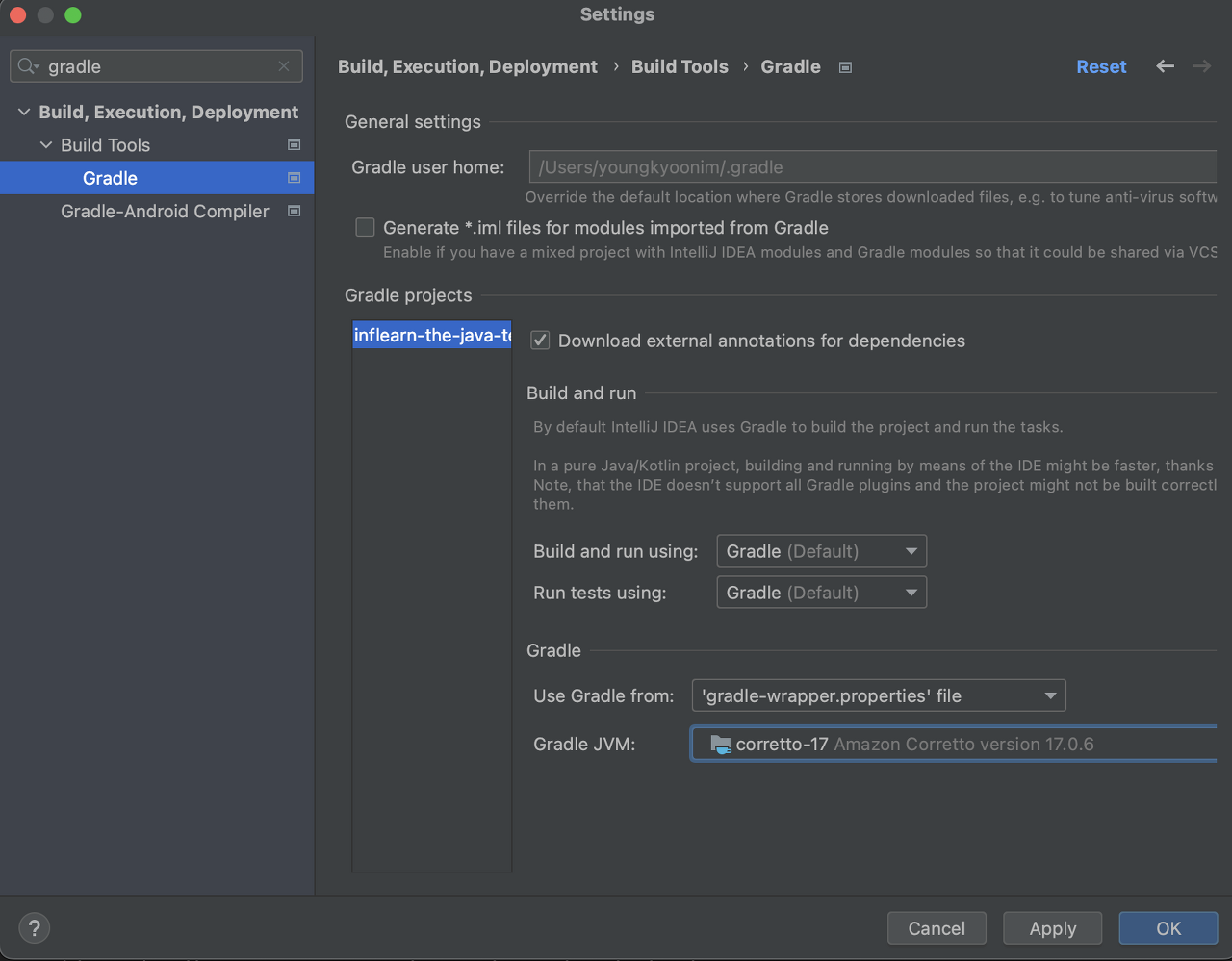 Gradle 설정에서 Gradle의 JVM이 Java 17이상인지 확인