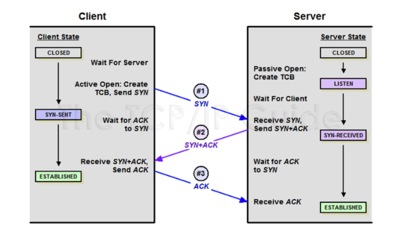 - 클라이언트가 목적지 서버의 IP 주소를 가지고 있으면, TCP 연결을 설정하기 위한 Three-Way Handshake 프로세스를 시작합니다.
