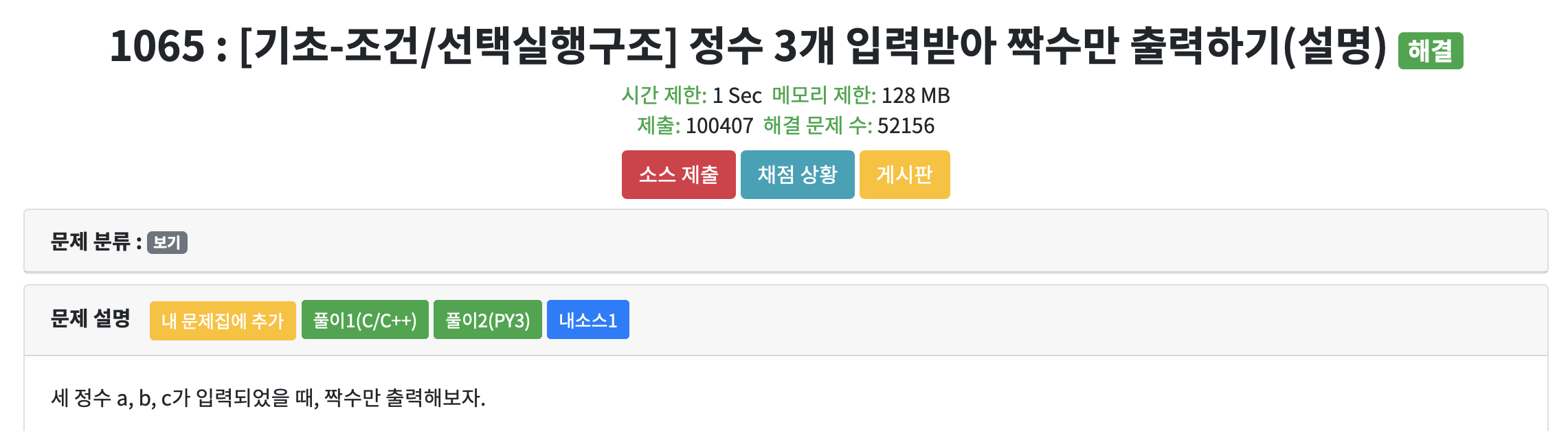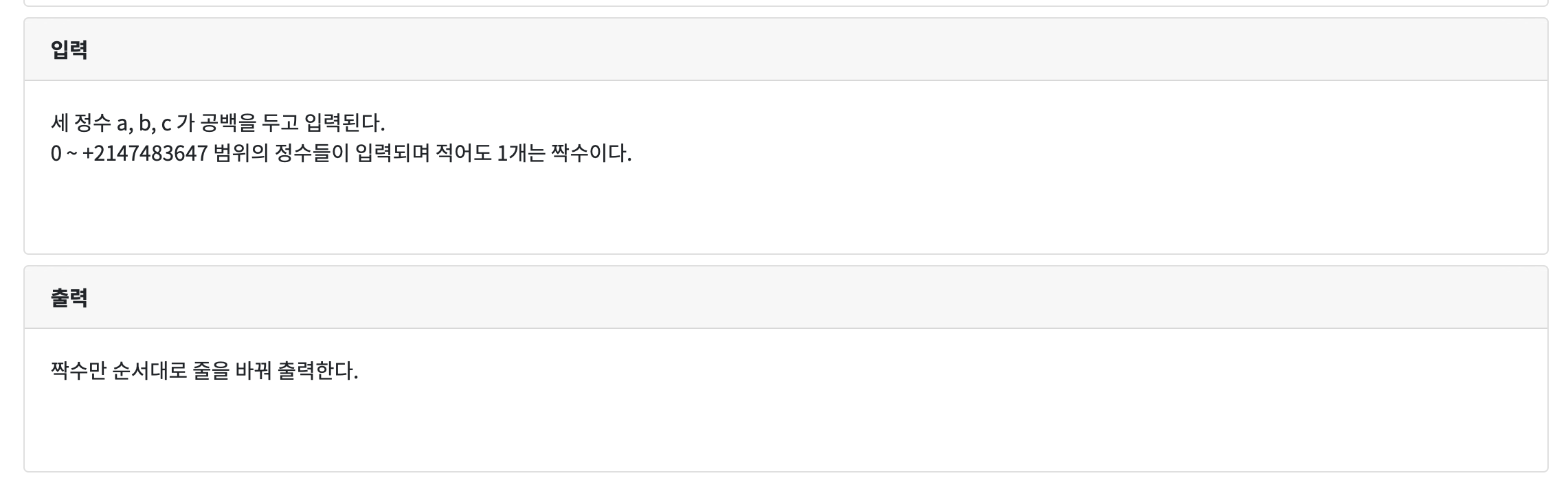 | CodeUp 1066[기초-조건/선택실행구조] 정수 3개 입력받아 짝/홀 출력하기(설명)-C/C++ (0) | 2020.08.06 |