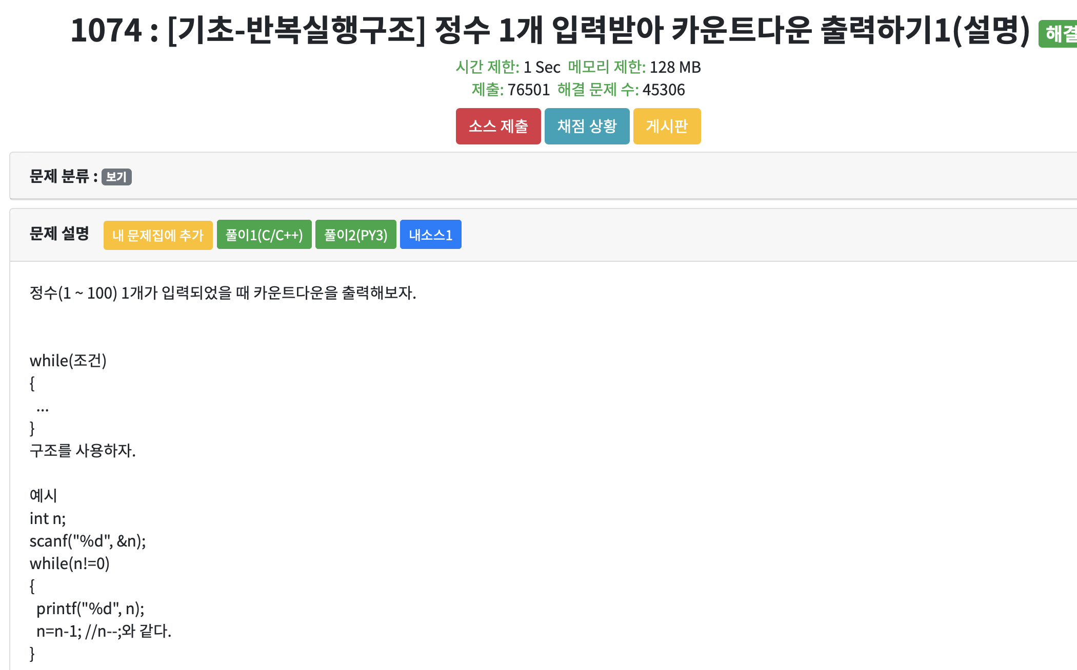 | CodeUp 1075[기초-반복실행구조] 정수 1개 입력받아 카운트다운 출력하기2 -C/C++ (0) | 2020.08.15 |